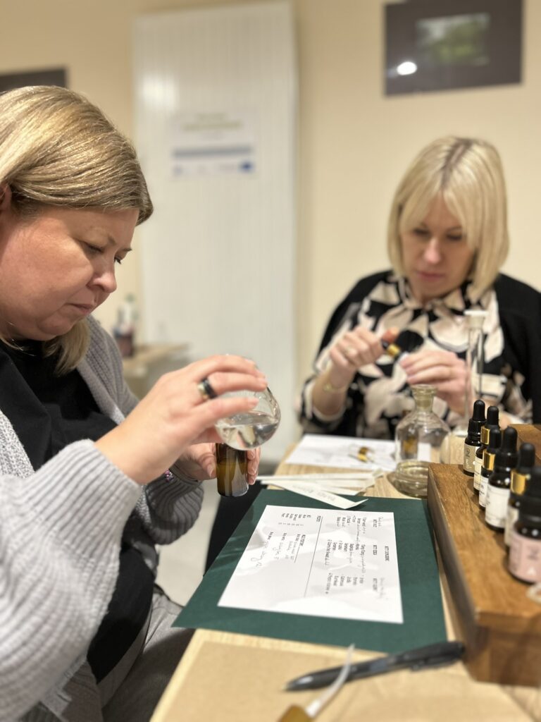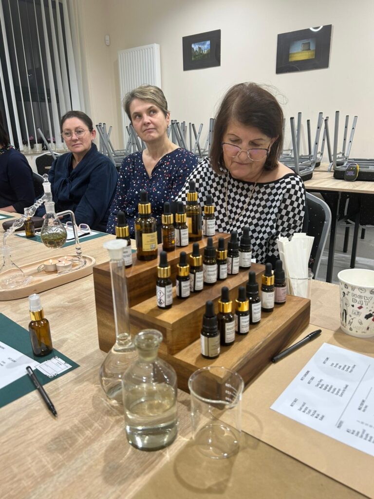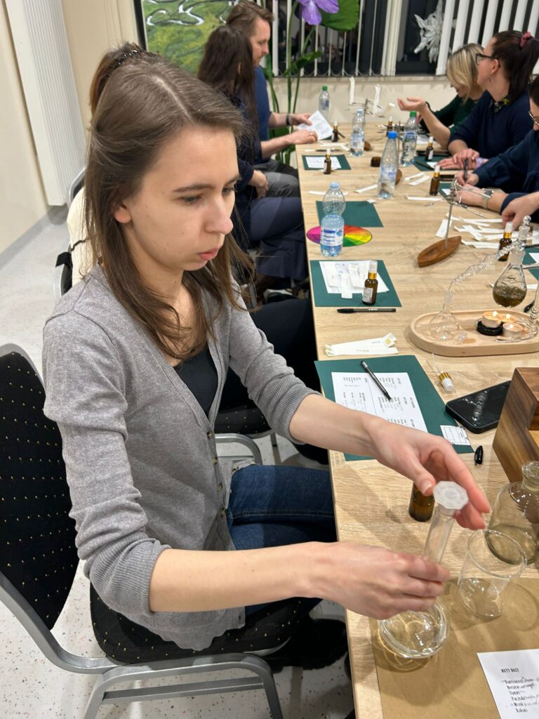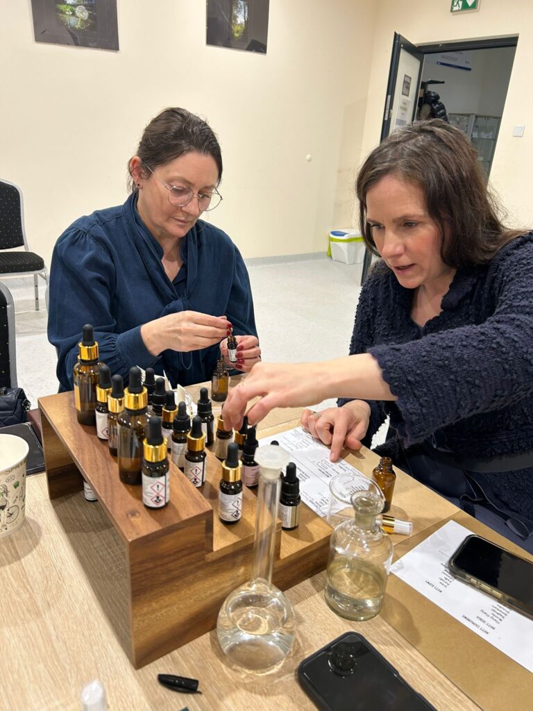Celem warsztatów było zapoznanie uczestników z podstawami perfumiarstwa naturalnego, w tym z teorią kompozycji zapachowych oraz charakterystyką poszczególnych nut zapachowych. Uczestnicy poznawali właściwości naturalnych olejków eterycznych i absolutów – od świeżych, cytrusowych akcentów, przez nuty ziołowe, po głębokie i trwałe esencje drzewne. Istotnym elementem zajęć była część praktyczna, podczas której każdy z uczestników, przy wsparciu prowadzącej, stworzył własną, autorską kompozycję zapachową. Gotowe perfumy stanowiły efekt samodzielnej pracy twórczej i zostały zabrane przez uczestników do dalszego użytkowania. Warsztaty miały charakter edukacyjno-doświadczalny i pozwoliły uczestnikom lepiej zrozumieć złożoność procesu tworzenia perfum oraz znaczenie umiejętnego łączenia nut zapachowych.